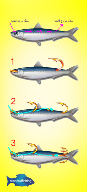 روش سوم بکار گیری طعمه ماهی کیلکاست که در تصویر زیر شیوه صحیح طعمه زنی رو براتون ترسیم کردم! البته توجه داشته باشین که سایز و طول ماهی های بکار رفته به عنوان طعمه باید بزرگتر از 10 سانتیمتر باشه! این سیستم به اندازه دو سیستم قبلی کارساز نیست و تا حدودی بستگی به شانس و احتمالات داره!!